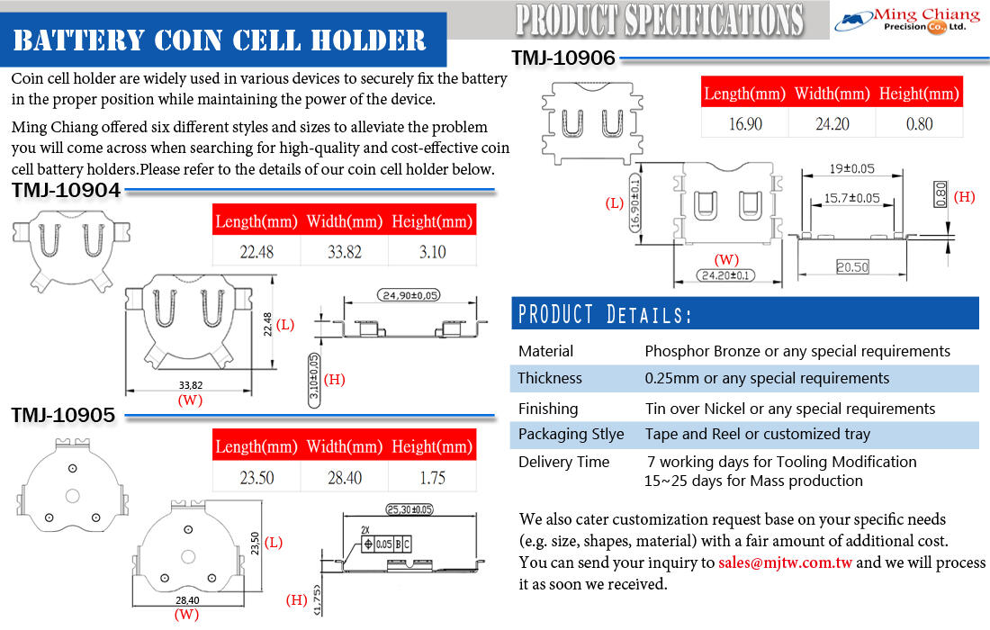 Ming Chiang は、コイン型電池ホルダーとスプリング電池コネクターに関する希望の仕様と要件 (デザインと寸法を含む) を達成するために既存のツールをカスタマイズするという個人的なリクエストも受け付けています。 その他の特定のニーズについては、いつでもご相談に応じます。 我々に教えてください。